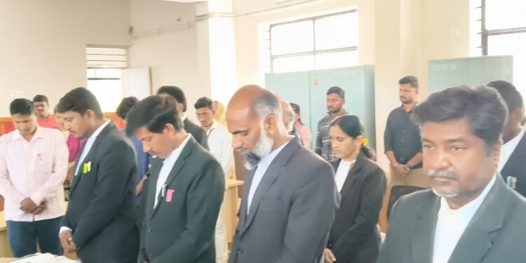 ಗುಡಿಬಂಡೆ ಜ30ರಂದು ನ್ಯಾಯಾಲಯದಲ್ಲಿ ಮಾನ್ಯ ಗೌರವಾನ್ವಿತ ಹಿರಿಯ ಶ್ರೇಣಿ ನ್ಯಾಯಾಧೀಶರಾದ ಶ್ರೀ ಪ್ರೇಮ್ ಕುಮಾರ್ ರವರ ಅಧ್ಯಕ್ಷತೆಯಲ್ಲಿ ಮೌನ ಆಚರಿಸಲಾಯಿತು ಈ ಸಂದರ್ಭದಲ್ಲಿ ವಕೀಲರ ಸಂಘದ ಎಲ್ಲಾ ಪದಾಧಿಕಾರಿಗಳು ಸದಸ್ಯರು ಮತ್ತು ನ್ಯಾಯಾಲಯದ ಸಿಬ್ಬಂದಿ ವರ್ಗದವರು ಭಾಗವಹಿಸಿದ್ದರು